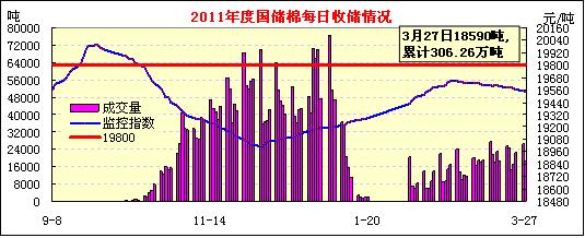 3月27日计划收储85500吨,实际成交18590吨,成交比例23%。较前一日减少7800吨。其中,新疆库点计划收储34000吨,实际成交8360吨,成交率25%;内地库计划收储51500吨,实际成交10230吨,成交率20%;截止今日2011年度棉花临时收储累计成交3062630吨,新疆累计成交1685240吨,内地累计成交1377390吨。