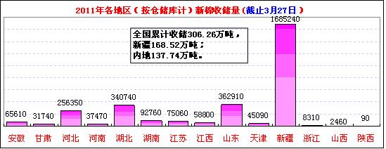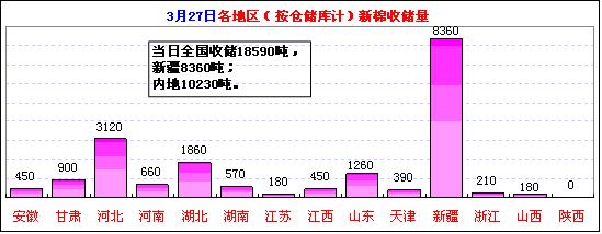 按仓储库收储地区汇总:当日收储较多的地区有:新疆8360吨,占45.0%,河北3120吨,占16.8%,湖北1860吨,占10.0%,山东1260吨,占6.8%,甘肃900吨,占4.8%等。截止3月27日,新疆库累计收储168.52万吨,占55.0%、山东36.29万吨,占11.8%、湖北34.07万吨,占11.1%、河北25.64万吨,占8.4%等。