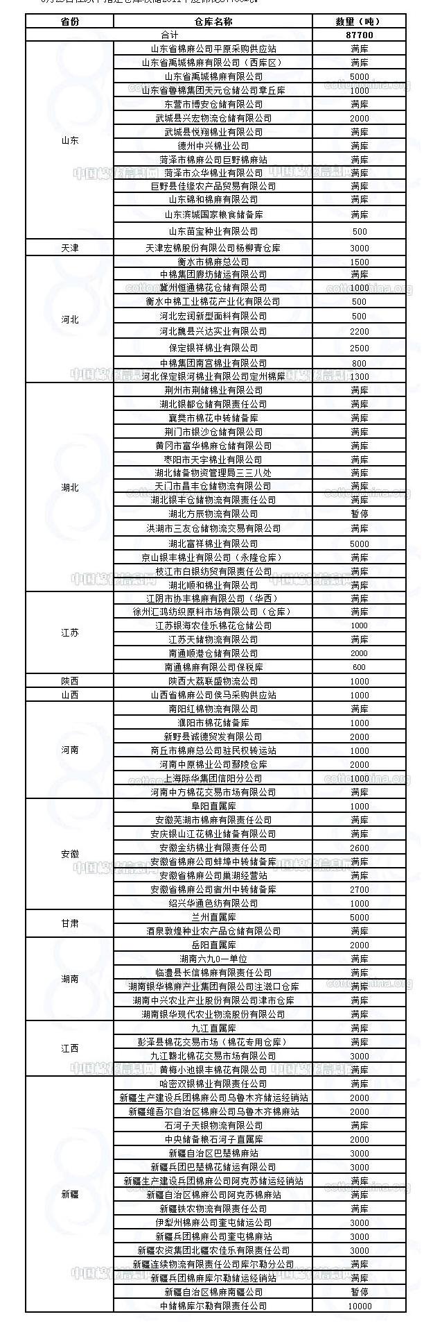 3月29日在以下指定仓库收储2011年度棉花87700吨。