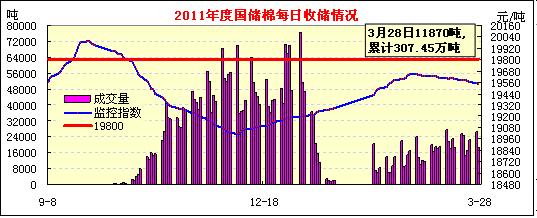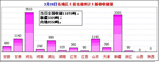 3月28日计划收储84100吨,实际成交11870吨,成交比例14%。较前一日减少6720吨。其中,新疆库点计划收储31000吨,实际成交3320吨,成交率11%;内地库计划收储53100吨,实际成交8550吨,成交率16%;截止今日2011年度棉花临时收储累计成交3074500吨,新疆累计成交1688560吨,内地累计成交1385940吨。