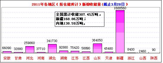按仓储库收储地区汇总:当日收储较多的地区有:河北3510吨,占29.6%,新疆3320吨,占28.0%,山东和甘肃各1140吨,各占9.6%,湖北990吨,占8.3%,等。截止3月28日,新疆库累计收储168.86万吨,占54.9%、山东36.40万吨,占11.8%、湖北34.17万吨,占11.1%、河北25.99万吨,占8.5%等。