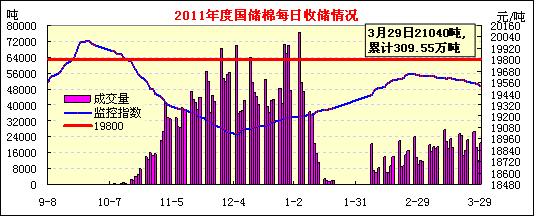 3月29日计划收储87700吨,实际成交21040吨,成交比例24%。较前一日增加9170吨。其中,新疆库点计划收储31000吨,实际成交8800吨,成交率28%;内地库计划收储56700吨,实际成交12240吨,成交率22%;截止今日2011年度棉花临时收储累计成交3095540吨,新疆累计成交1697360吨,内地累计成交1398180吨。
