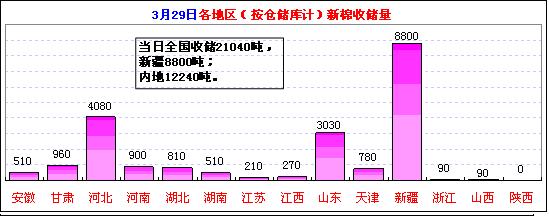 按仓储库收储地区汇总:当日收储较多的地区有:新疆8800吨,占41.8%,河北4080吨,占19.4%,山东3030吨,占14.4%等。截止3月29日,新疆库累计收储169.74万吨,占54.8%、山东36.71万吨,占11.9%、湖北34.25万吨,占11.1%、河北26.39万吨,占8.5%等。