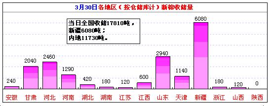 按仓储库收储地区汇总:当日收储较多的地区有:新疆6080吨,占34.1%,山东2940吨,占16.5%,河北2460吨,占13.8%,甘肃2040吨,占11.5%等。截止3月30日,新疆库累计收储170.34万吨,占54.7%、山东37.00万吨,占11.9%、湖北34.30万吨,占11.0%、河北26.64万吨,占8.6%等。
