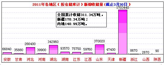 3月30日计划收储94600吨,实际成交17810吨,成交比例19%。其中,新疆库点计划收储31000吨,实际成交6080吨,成交率20%;内地库计划收储63600吨,实际成交11730吨,成交率18%;截止今日2011年度棉花临时收储累计成交3113350吨,新疆累计成交1703440吨,内地累计成交1409910吨。