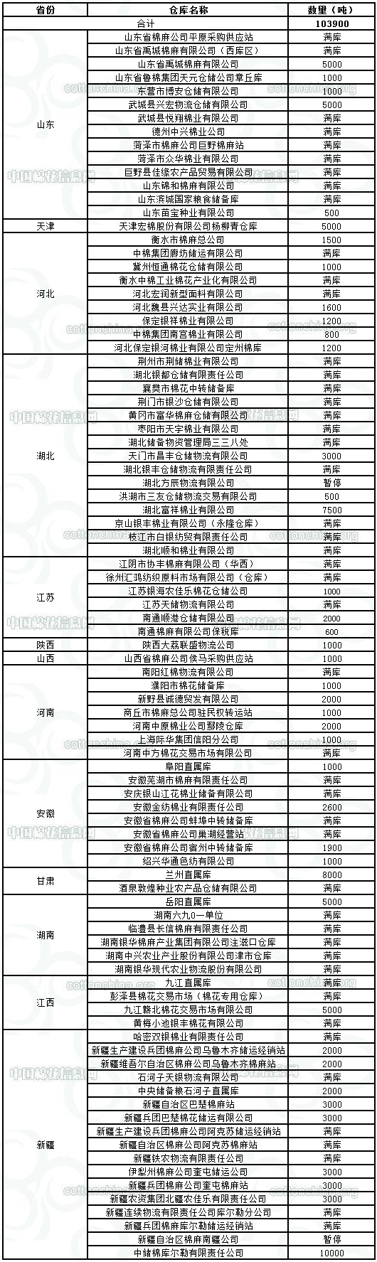 3月31日在以下指定仓库收储2011年度棉花103900吨。