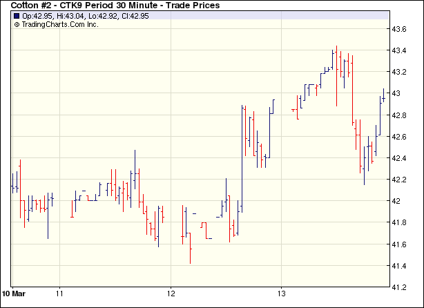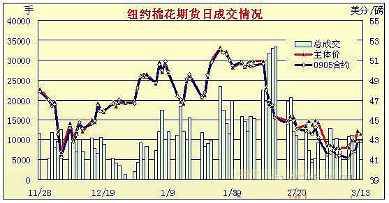 3月12日,美国股市在连续上涨后小幅震荡;另外市场关注欧佩克周末是否减产,原油小幅走跌;美元走弱,受此影响,纽约期棉乏善可陈,小幅震荡,最终纽约期棉5月合约震荡收平,其它大多合约小幅走跌。当日纽约期棉微弱高开,外围形势继续对期棉走势产生较大影响,美元趋弱,而早盘原油看涨,股市开盘走强促使投机买盘进入期棉市场,5月合约小幅冲高至43.44美分,但买盘力量逐渐衰竭,高位获利平仓盘打压,同时原油开始走弱,股市调整,期棉价格快速回落,5月合约最低42.15美分(跌68点),但尾随股市再度回升,期棉尾盘爬升,盘终5月合约收平,2010年12月合约收涨17点,其它合约小跌40点以内。