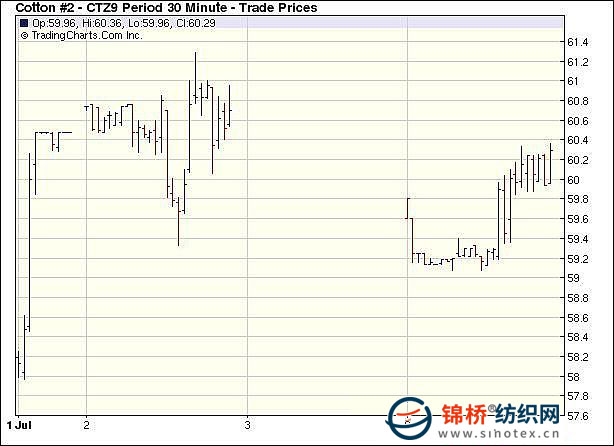 7月6日纽约期外围商品走跌助推,盘中大多合约中幅下跌,12月合约跌68点收于60.24美分。当日纽约期棉低开低走,由于上周期棉大幅上攻,因此获利卖盘打压期棉大幅走低,同时外围商品均走弱,兼全球股市走弱(美盘小涨倒是例外)也拖拽期棉下跌,盘中12合约最低跌至59.07美分,然后获得部分买盘支撑,缓慢上涨,盘终缩窄跌幅,但成交大幅缩量,仅有5100手。