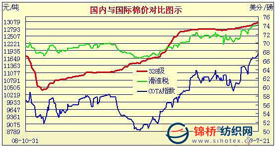 7月21日成交量进一步减少,价格小阳。当日计划抛售储备棉数量为54928吨,其中,2003/04年度储备棉13365吨,2008年度收储棉41563吨。实际成交30714吨,其中2003/04年度储备棉全部成交;2008年度棉花成交17349吨,流拍24214吨;成交比例继续回落至56%;加权成交价12789元/吨;折328级成交价13216元/吨,涨32元。当日成交2008年度储备棉平均等级3.15,提升0.16级,平均长度28.33,加权成交价12987元/吨,涨59元,折328级成交价为13001元/吨,基本持平。当日成交2003年度储备棉平均等级5.17,降0.29级,平均长度26.98,加权成交价12532元/吨,跌108元,折328级成交价为13476元/吨,涨78元。 截止7月21日,累计成功抛售储备棉1026165吨,其中2008年度储备棉521390吨,2003/2004年度棉花504775吨。