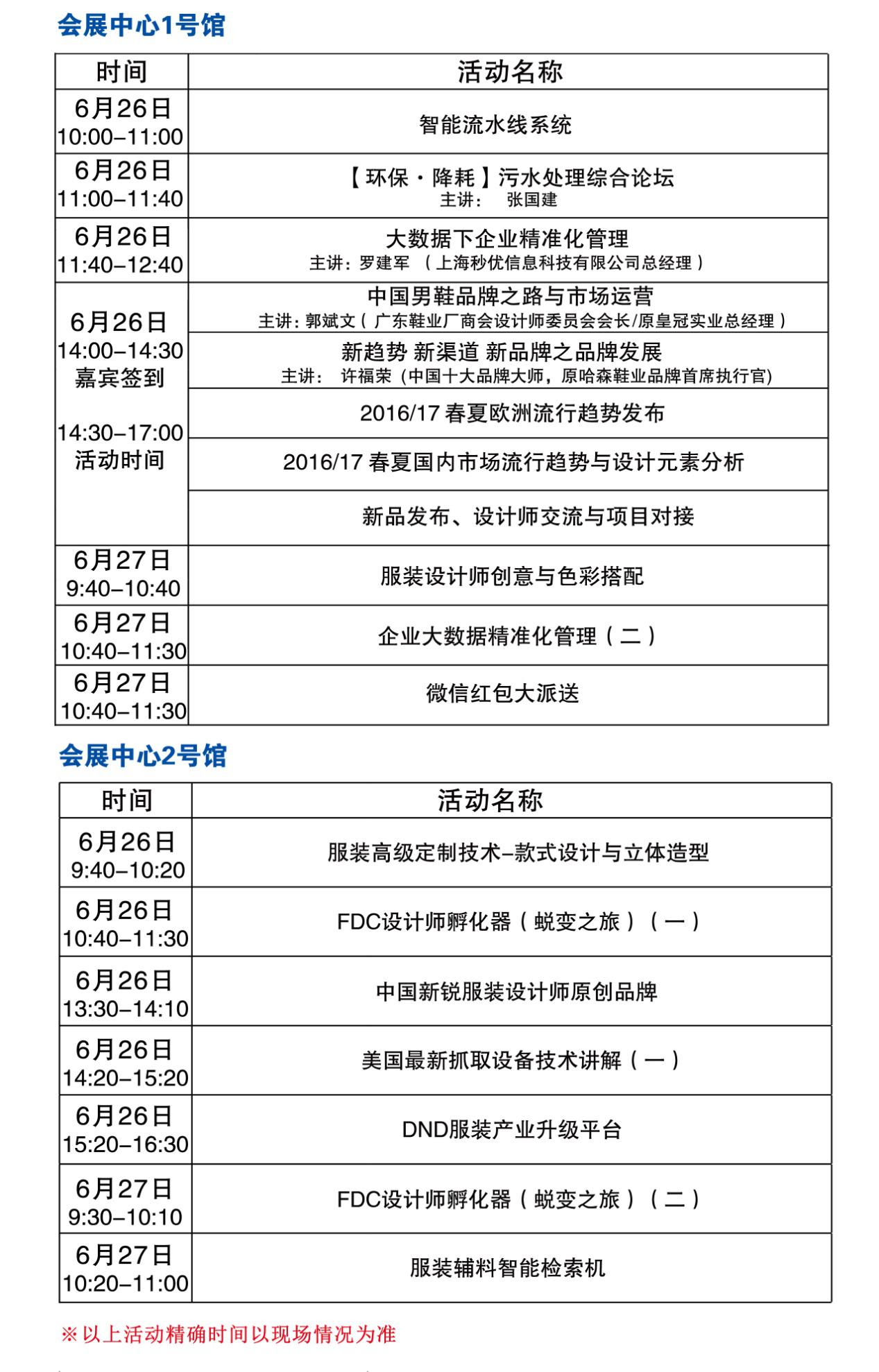 从组委会获得信息,为了满足展商和观众的各类需求,组委会筹备了众多的精彩活动,将于展期“闪亮登场”。本次会期活动类型之多、内容覆盖面之广“史无前例”,涵盖了行业新趋势、新技术及新的生产模式的讲解论坛,环保绿色降耗的生产思路引领,2016/17年流行趋势的介绍,当下时兴的互联网+等电子商务大数据管理等,可为亮点多多,精彩不断,“你”不容错过!