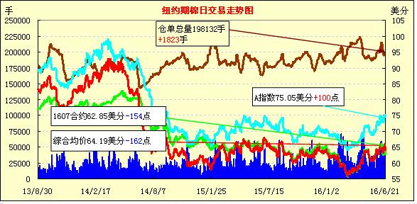 6月21日,受商品市场整体表现弱势和中国郑棉大跌带动,在经历连续三日上涨后,主力1612月合约以大跌收盘,结算价64.39美分/磅,跌160点,近月1607合约结算价62.85美分,跌154点。当日1612月合约高开后未能站稳66美分高位,交易中期寻求65美分一线的支撑,交易后期重心继续下移,尾段在64-64.5美分间波动,最终收于该区间。美元指数走高、谷物(大豆、玉米和小麦期货)均下跌,以及郑棉大跌,纽约期棉承压。