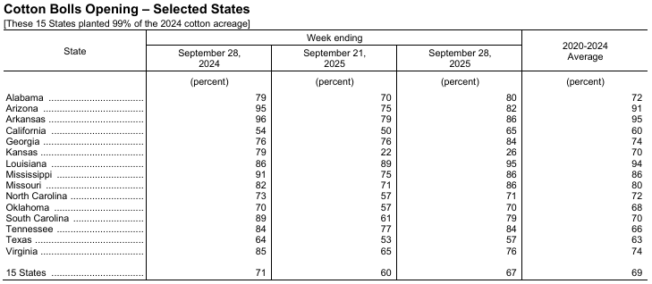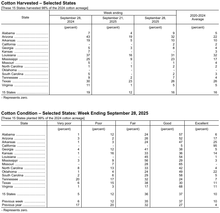 美国农业部(USDA)在每周作物生长报告中公布称,截至2025年9月28日当周,美棉盛铃率为67%,前周为60%,上年同期为71%,五年均值为69%。美棉收割率为16%,前周为12%,去年同期为19%,五年均值为16%。美棉优良率为47%,前周为47%,上年同期为31%。