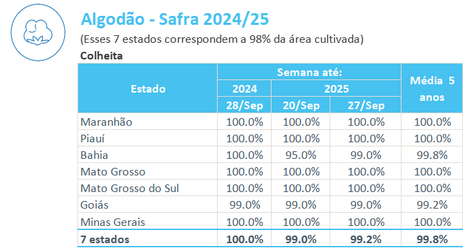 据巴西农业部下属的国家商品供应公司CONAB,截至9月27日,巴西棉花收割率为99.2%,上周为99%,去年同期为100%,五年均值为99.8%。