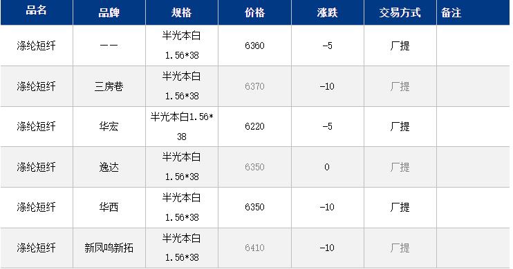江苏涤纶短纤现货价格下跌5元到6360元/吨。外围消息仍存较大不确定性,业者心态谨慎,短纤期货较夜盘变动不大;早间现货主流6330-6400元/吨自提,偏低6200元/吨附近自提。