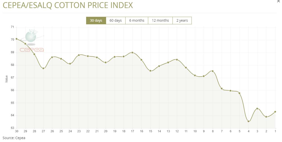 10月15日(周三),巴西CEPEA/ESALQ棉花价格指数报64.30美分/磅,较前一交易日上涨0.63%,较上月同期下跌6.04%。