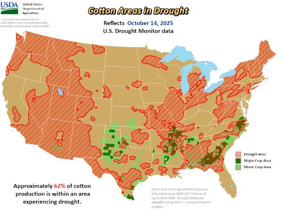 美国农业部(USDA)下属的首席经济学家办公室(OCE)当地时间周四根据当日发布的美国旱情监测图整理的美国农业旱情文件显示,截至10月14日当周,大约62%的美棉产区受到干旱影响,高于之前一周的61%。