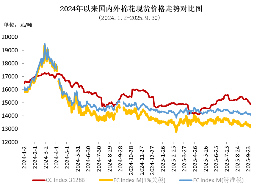 9月前半月,美联储决定下调联邦基金利率,受此影响美元走弱、大宗商品市场情绪升温,带动国际棉价上涨;后半月市场焦点重回棉花自身基本面,在北半球新棉丰产及美棉出口销售数据疲软的共同作用下,国际棉价由涨转跌。ICE期棉主力合约月均结算价66.44美分/磅,环比下跌0.75美分,跌幅1.12%。中国进口棉价格指数FCIndexM月均价75.74美分/磅,环比下跌0.82美分,跌幅1.08%;月底74.72美分/磅,环比下跌1.85美分,1%关税下折人民币13146元/吨,低于同期中国棉花价格指数(CCIndex3128B)1716元,内外棉价差环比缩小120元。