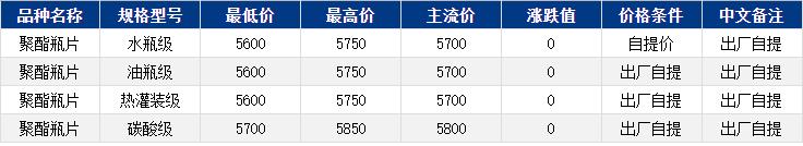 华东聚酯瓶片收于5700元/吨,涨跌值0元/吨,原料继续上涨,然而聚酯瓶片僵持整理。10-11月货源报盘5600-5750元/吨,实单递盘零星。