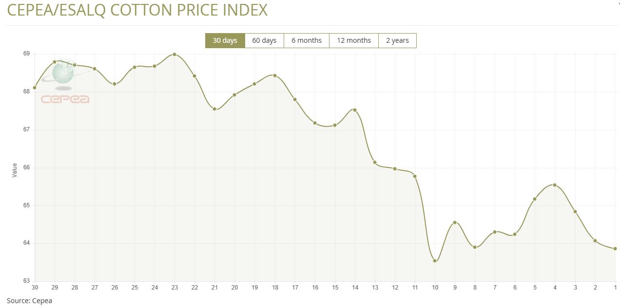 10月23日(周四),巴西CEPEA/ESALQ棉花价格指数报63.86美分/磅,较前一交易日下跌0.33%,较上月同期下跌6.68%。