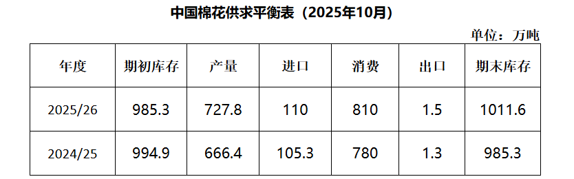 中国棉花协会预测:2025/26年度全国棉花产量727.8万吨,较上期上调6.2万吨,同比增长9.2%;棉花进口量110万吨,同比增长4.5%;消费量810万吨,同比增长3.8%,期末库存相应升至1011.6万吨,同比增长2.7%。
