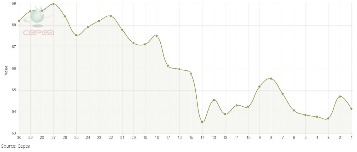 10月29日(周三),巴西CEPEA/ESALQ棉花价格指数报64.15美分/磅,较前一交易日下跌0.87%,较上月同期下跌6.25%。
