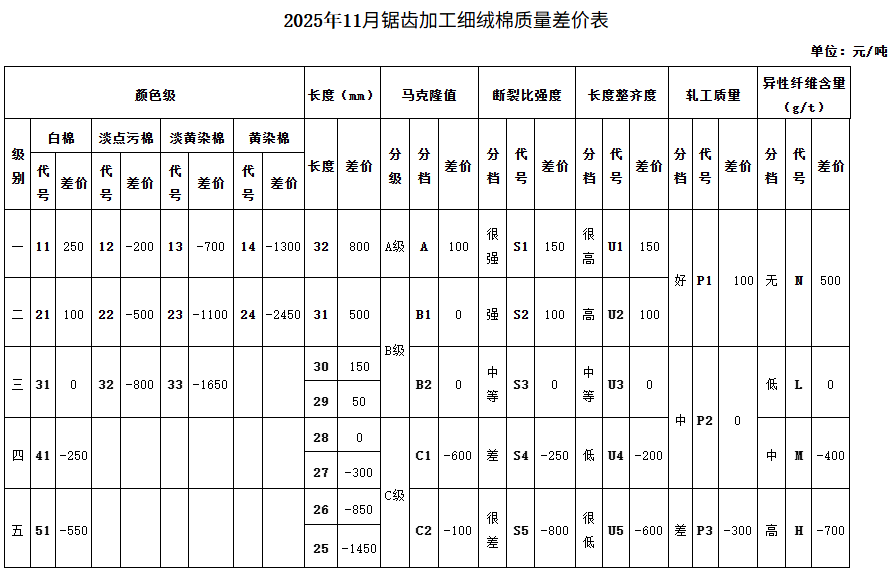 根据《中国棉花协会国产棉质量差价表管理办法》规定,现正式发布2025年11月《锯齿加工细绒棉质量差价表》、《皮辊加工细绒棉质量差价表》、《长绒棉质量差价表》(单位:元/吨)。