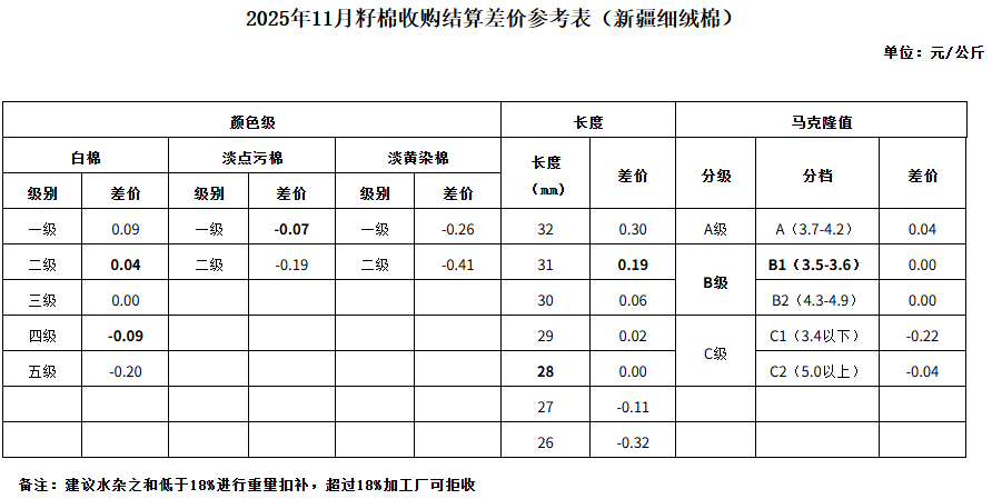 依据中国棉花协会发布的2025年11月《锯齿加工细绒棉质量差价表》和2025年9-10月新疆籽棉平均公定衣分率,折算得出籽棉收购差价,与上月相比,做如下调整: