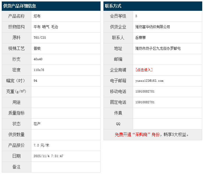 11月4日,潍坊富华纺织有限公司涤棉平布T65/C35 40x40 110x76 94" 喷气 毛边,报价为7.2元/米,实际成交价以协商为准。[点击查看详情]