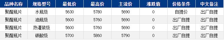 华东聚酯瓶片收于5690元/吨,涨跌值0元/吨,原油继续下跌,成本无力支撑,聚酯瓶片工厂多持稳,市场重心僵持整理,11月货源报盘5600-5760或期货合约2601升水10至80,递盘5620-5700,早间听闻12月货源5620零星成交。