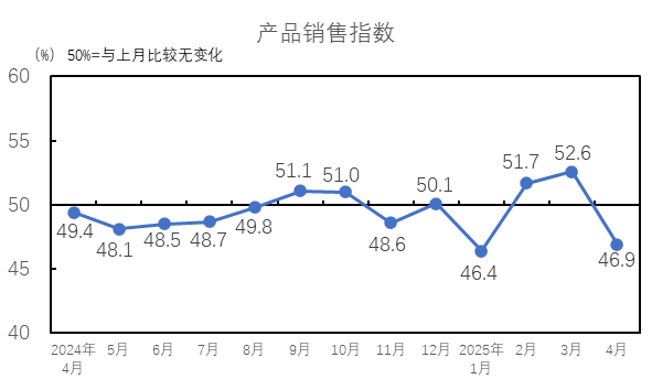 2025年4月,生产指数为48.0%,低于临界点,较3月下降6.7个百分点。4月受特朗普关税战影响,外贸预期受挫,下游需求放缓,纺织企业订单下降,销售不畅,生产情况出现下降。从分项指数看,棉纺织企业设备开台率指数为49.2%,低于临界点,较3月下降2.6个百分点。纱产量指数为47.1%,较3月下降10.9个百分点;布产量指数为46.6%,较3月下降10.4个百分点;纱、布产量指数均低于临界点。