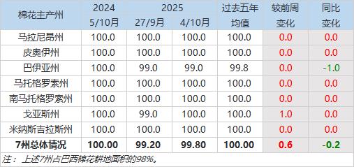 据巴西农业部下属的国家商品供应公司CONAB,截至10月4日,巴西棉花收割率为99.8%,上周为99.2%,上年同期为100%,五年均值为100%。