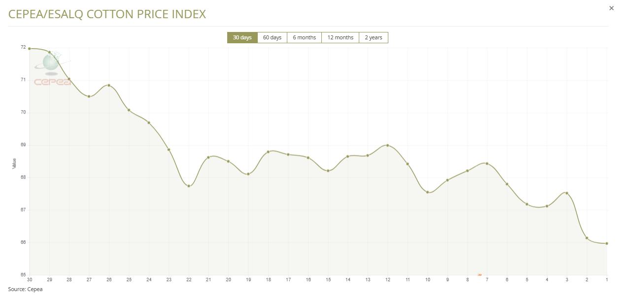 10月8日(周三),巴西CEPEA/ESALQ棉花价格指数报65.97美分/磅,较前一交易日下跌0.26%,较上月同期下跌3.59%。