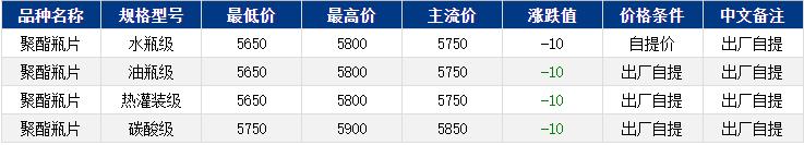 华东聚酯瓶片5750元/吨,涨跌值-10元/吨,原料支撑不足,聚酯瓶片工厂部分挺价报稳,部分下调30元/吨,市场重心偏弱调整,11-12月货源报盘5650-5800元/吨,局部略高5830元/吨或期货合约2601贴水20至升水60;递盘5720-5760元/吨。