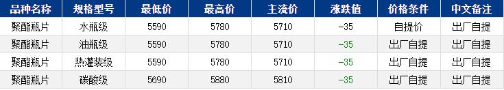 华东聚酯瓶片收于5710元/吨,涨跌值-35元/吨,原油大幅下跌,拖累原料下行,聚酯瓶片工厂多下调50元/吨,市场重心下滑。11-12月货源报盘5590-5780元/吨或期货合约2601平水至升水60,递盘5620-5690元/吨,下游、贸易商逢低补货,递盘较昨日明显增加。