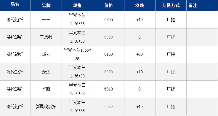 江苏涤纶短纤现货价格上涨10元到6305元/吨;油品需求短期提振PX,成本上涨带动短纤价格小涨,早间现货主流6300-6340元/吨自提,偏低6160元/吨附近自提。