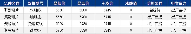 华东聚酯瓶片收于5745元/吨,涨跌值0元/吨,原油、原料震荡偏弱,聚酯瓶片工厂部分持稳,部分下调20元/吨,市场重心僵持整理。11-12月货源报盘5650-5780元/吨,局部略低5630元/吨,略高5820元/吨或期货合约2601贴水20至升水70,递盘5690-5750元/吨。