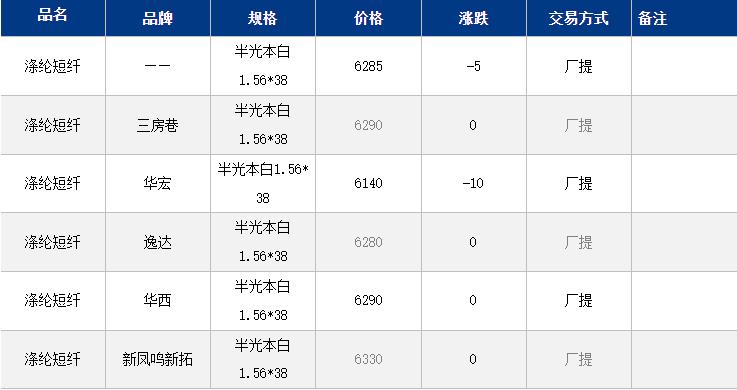 1.4D半光直纺涤纶短纤江浙商谈重心6150-6400元/吨出厂或短送,福建主流商谈6200-6400元/吨现款短送,山东、河北主流6250-6500元/吨送到。