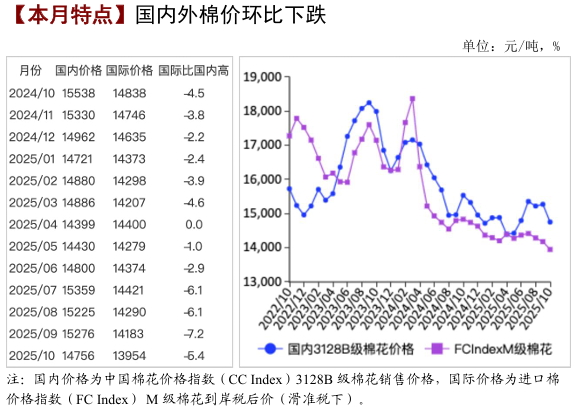 (一)国内棉价环比下跌。本月,下游纺织市场“金九银十”旺季成色不足,原料库存水平整体偏高,企业购棉意愿不强。据国家棉花市场监测系统抽样调查,10月初全国棉花工业库存约78.5万吨,同比增加11.2%,比近五年同期平均水平增加21.4%。采购意向调查显示,10月初准备采购棉花的企业占46%,同比减少2.2个百分点,比近五年同期平均水平增加5.5个百分点。10月国内3128B级棉花月均价每吨14756元,环比跌3.4%,同比跌5.0%。郑棉期货主力合约(CF601)月结算价每吨13565元,环比涨0.8%,同比跌3.5%。