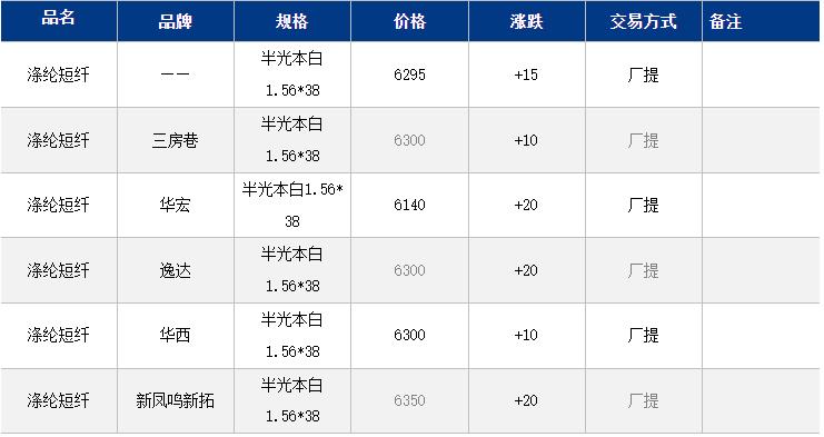 1.4D半光直纺涤纶短纤江浙商谈重心6200-6400元/吨出厂或短送,福建主流商谈6250-6400元/吨现款短送,山东、河北主流6300-6500元/吨送到。