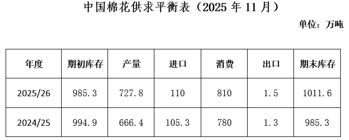 中国棉花协会预测:2025/26年度全国棉花产量727.8万吨,同比增长9.2%;棉花进口量110万吨,同比增长4.5%;消费量810万吨,同比增长3.8%,期末库存为1011.6万吨,同比增长2.7%。