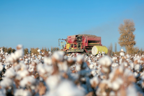 图为新疆维吾尔自治区沙雅县的棉田内,采棉机正在进行机械化收棉作业。