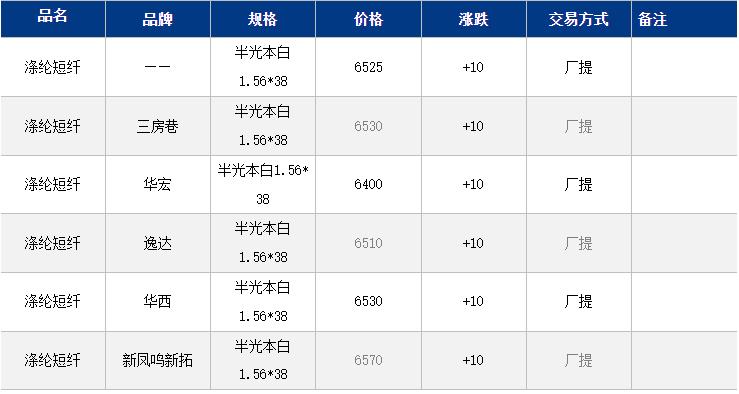 1.4D半光直纺涤纶短纤江浙商谈重心6400-6600元/吨出厂或短送,福建主流商谈6450-6600元/吨现款短送,山东、河北主流6500-6750元/吨送到。
