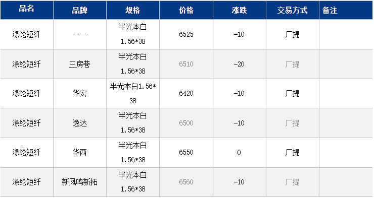 江苏涤纶短纤现货价格下跌10元到6525元/吨;目前江苏主流6500-6560元/吨自提,偏低货源6420元/吨附近。