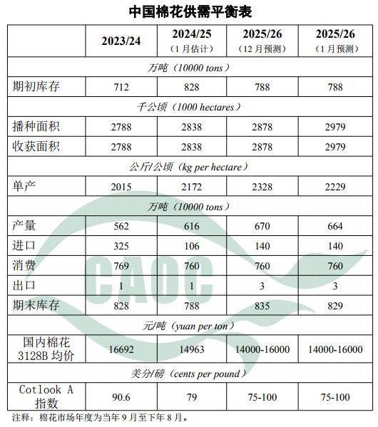 2025/26年度中国棉花生产预测与国家统计局公布数据基本一致,本月数据根据国家统计局公告进行微调。其中,棉花播种面积调至2979千公顷,较上年增5.0%;单位面积产量调至每公顷2229公斤,较上年增2.6%;总产量调至664万吨,较上年增7.7%。本月进口量和消费量预测数据维持上月不变,期末库存调减至829万吨。受纺织厂春节前补库需求影响,皮棉销售进度明显加快。据中国棉花网数据,截至1月8日,全国棉花加工率94.5%,同比减0.5个百分点;销售率55.6%,同比增24.1个百分点。