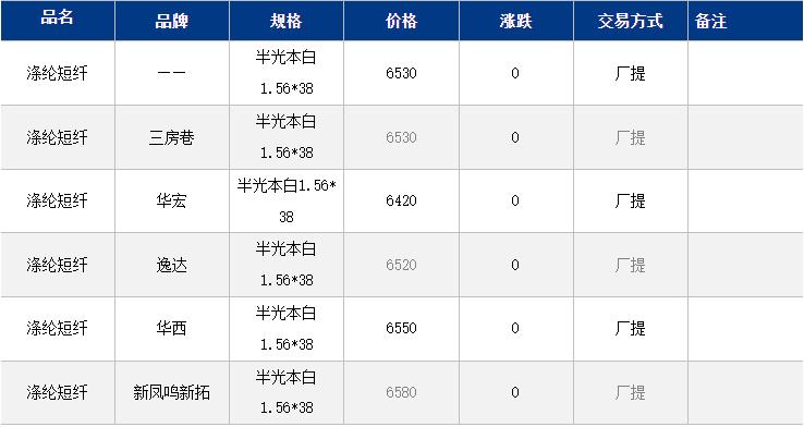 1.4D半光直纺涤纶短纤江浙商谈重心6400-6600元/吨出厂或短送,福建主流商谈6500-6600元/吨现款短送,山东、河北主流6500-6750元/吨送到。