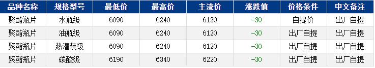 华东聚酯瓶片收于6120元/吨,涨跌值-30元/吨,原油回调,拖累能化产品整体回落。成本支撑不足,加之现货加工费已恢复至550元/吨附近,下游维持刚需补货,聚酯瓶片重心回落,1-2月货源报盘6090-6240元/吨,主流6090-6140元/吨,递盘6030-6100元/吨;或期货合约2603升水10至40,递盘交昨天少量增加,贸易商补空。因部分货源流通紧张,持货商低价出货谨慎。
