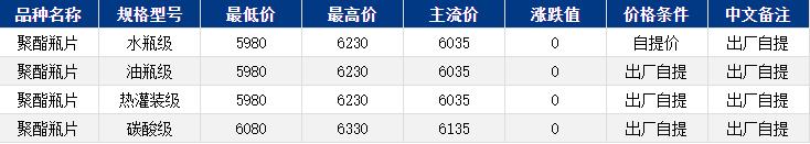 华东聚酯瓶片收于6035元/吨,涨跌值0元/吨,商品情绪偏弱,聚酯瓶片工厂部分维稳,重心僵持整理。1月货源报盘6000-6060元/吨,局部略高6230元/吨,略低5980元/吨。递盘5980-6020元/吨,下游观望心态浓厚,实单递盘稀少。