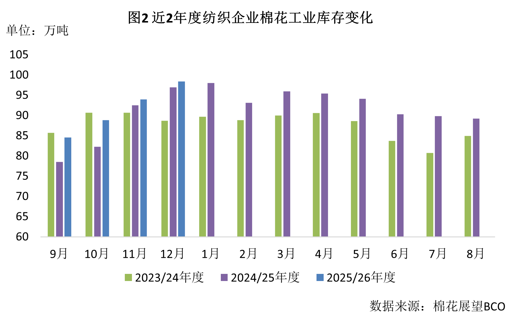 12月新棉仍处大量上市期,纺织厂根据需求随用随买,棉花库存略有增加,截至12月底纺织厂在库棉花工业库存量为98.38万吨,较上月底增加4.42万吨。纺织厂可支配棉花库存量为115.62万吨,较上月底增加4.98万吨。其中:20%企业增加棉花库存,33%减少,47%基本保持不变。下半月随着棉价上涨企业观望态度增强,原料采购趋于谨慎。