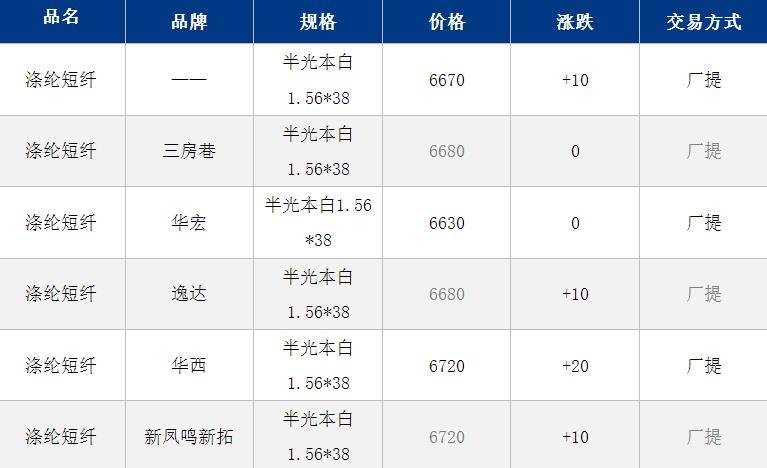 江苏涤纶短纤现货价格上涨10元至6670元/吨;需求平淡但原油盘中上涨提振TA-PF端,今日短纤期现货价格仍有上涨。目前江苏主流商谈6680-6720元/吨自提,偏低货源6630元/吨附近。