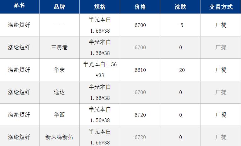 江苏涤纶短纤现货价格下跌5元至6700元/吨;早间原油、聚酯原料期货转弱下跌,短纤现货小幅跟跌,目前江苏主流商谈6670-6720元/吨自提,偏低货源6600元/吨附近。